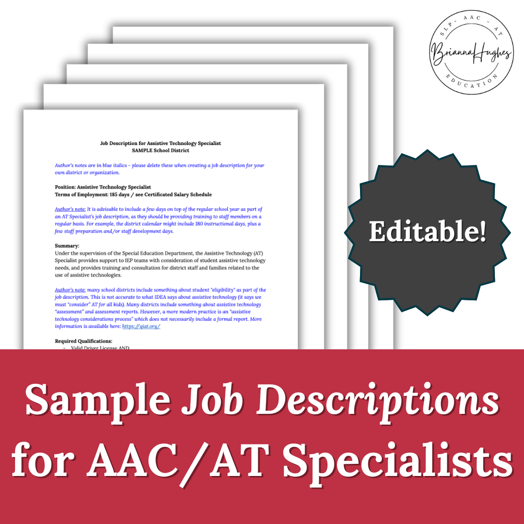 What does an AT Specialist do? And what does an AAC specialist do? This document offers sample school district job descriptions for both roles. It's fully editable, with notes to explain all the key terms, and links to further reading. Whether you're advocating for the creation of a new AAC and/or AT Specialist job, or refining your district's existing job description, this freebie makes a great starting point!