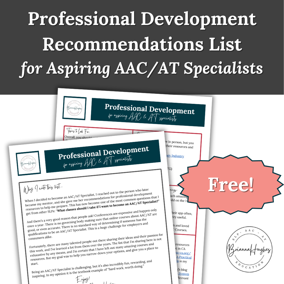 In this free guide, you'll get a short list of the courses and resources I recommend the most often to professionals who are looking to learn more about AAC/AT, and especially to those aspiring to become an AAC/AT specialist. There are many great resources out there, but these are my personal recommendations. I only included the ones I loved and learned a ton from!